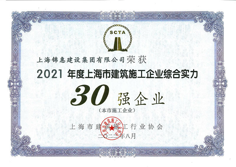 (2021年度上海市建筑施工企業(yè)綜合實(shí)力30強企業(yè)證書(shū))